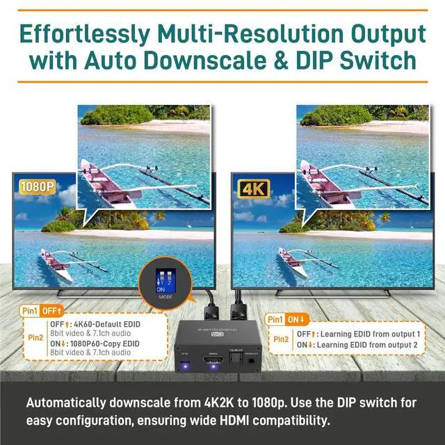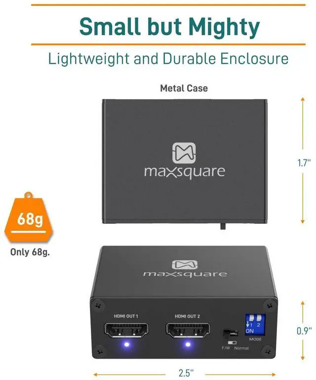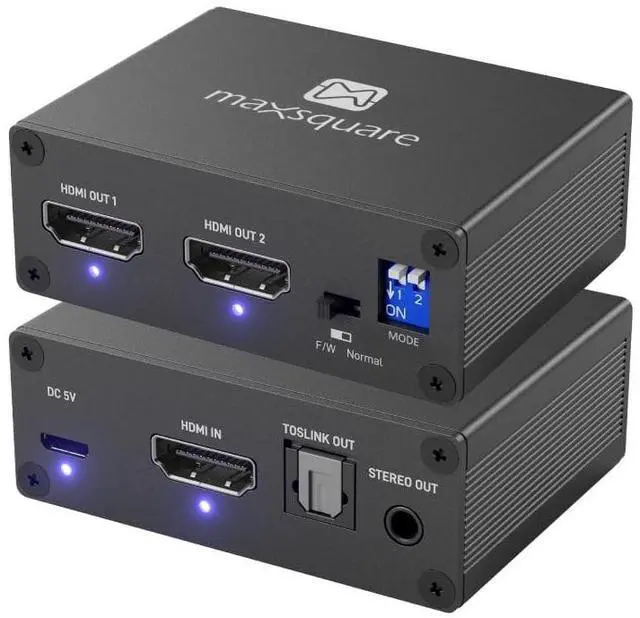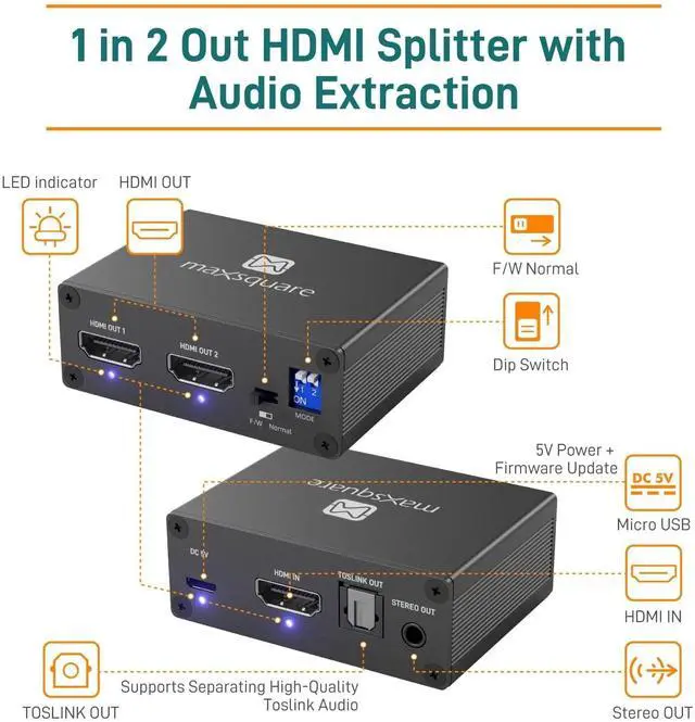 HDMI 1 In 2 Out SplitterEffortlessly duplicate one HDMI signal to two displays simultaneously without any quality loss. Supports HDMI 2.0, HDCP 2.2 / 1.4, 3D and HDR, resolution up to 4K2K 60Hz 4:4: 4 8bits. Also, the downscale function detects the HDMI source signal and downscales it automatically to be compatible with 1080p monitors for output 1 and 2. ^^ Splitter with Audio ExtractionExtract embedded audio from HDMI inputs and output to high-quality digital Toslink (S/PDIF) or analog stereo 3.5 mm phone jack. Enjoy optimal audio-video synchronization experience with just one device. *Please note that this device DOES NOT Support ARC. * ^^ Multi-Resolution OutputThe specially designed feature allows you to easily downscale your 4K signal input to perfectly fit a 1080p display. Additionally, the DIP switch lets you select between default EDID, copy EDID, or learning EDID for effortless configuration, ensuring broad HDMI video compatibility. ^^ Wide CompatibilityFlexible and ideal HDMI device with wide compatibility, perfect for live streaming, home theater, meetings, and entertainment, supporting various HDMI source devices such as TV Box, Blu-ray/DVD/HD players, Apple TV, Roku, gaming consoles (PS3/PS4/PS5, Xbox/Xbox Series X/S, Nintendo Switch), HD cameras, PC/laptop, HD DVRs and others. ^^ Superior Quality and Customer ServiceMade in Taiwan (TAA Compliant), all MAXSQUARE products come with ESD protection and are CE/FCC/RoHS certified.