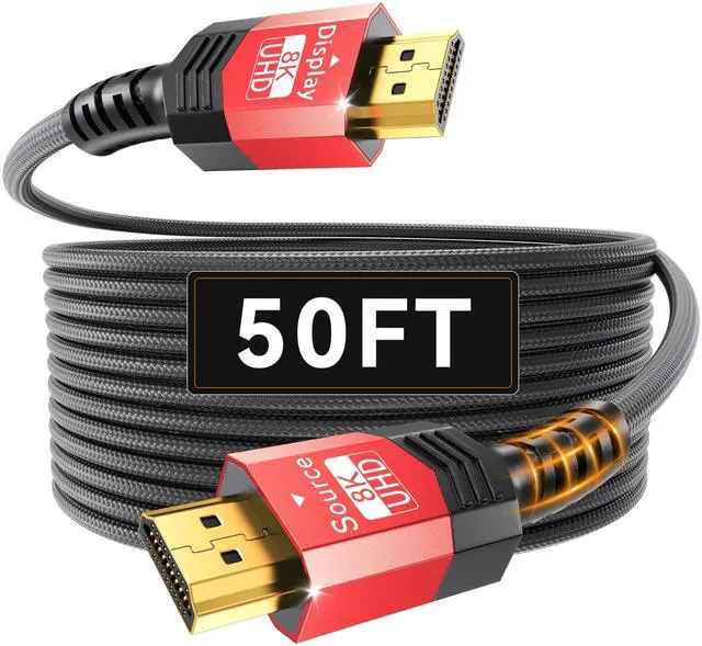DTS: X sound. Lip-sync issues are a thing of past, pulling you completely into the story. ^^ [Heavy-duty and flexible]Slim 50 HDMI to HDMI 2.1 cable features 24K gold-plated connectors, aluminum shell, built-in interference shielding and SR flexible reinforcement structure. Its flexible cable is further protected by dual-layer mesh wrapping and nylon braiding technology. After withstanding 25, 000 bend tests, it maintains its original performance, significantly extending its service life. ^^ [Simplify Your Life]8K HDMI 2.1 cable is fully backward compatible HDMI 2.0 a/ 2.0 b, it can replace every older HDMI cable in your home for a simpler, superior, and future-proof connection. It's rigorously tested for use with HDTVs, monitors, game consoles, soundbars, and more, ideal for both indoor and outdoor entertainment. ^^ [NOTE]The fiber optical hdmi 2.1 cables 50 feet has directionality. Connect the interface labeled "Source" to the input/source device (such as a player, PS, Xbox AV Receiver, etc. ), and connect the interface labeled "Display" to the display device (such as a computer, HD TV). Otherwise, the display device will not work.