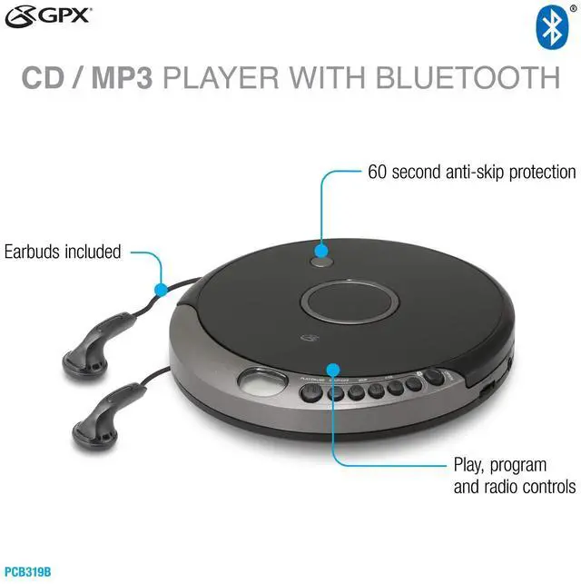 Stream CDs and MP3-CDs to your Bluetooth headphones or speaker with the GPX portable CD player with Bluetooth. This portable player Features 40 second anti-skip protection for CDs, 100 second anti-skip protection for MP3 CDs, an LCD display, and low battery indicator. Stereo earbuds are included to give you maximum listening enjoyment. Requires 2 AA batteries (not included). Black.