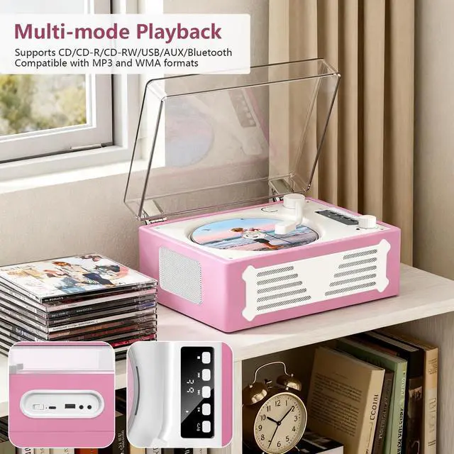 Ideal for use at home or on the go, this compact portable cd player wont let interruptions ruin your vibe. ^^ LED Display & Easy ControlEquipped with an LED screen and simple button operation interface, this vintage cd player makes it easy to manage playback, switch modes (CD/USB/AUX/Bluetooth), and adjust settings. The intuitive interface ensures anyone can enjoy music effortlessly. This portable cd player with speakers is designed for convenience and style.