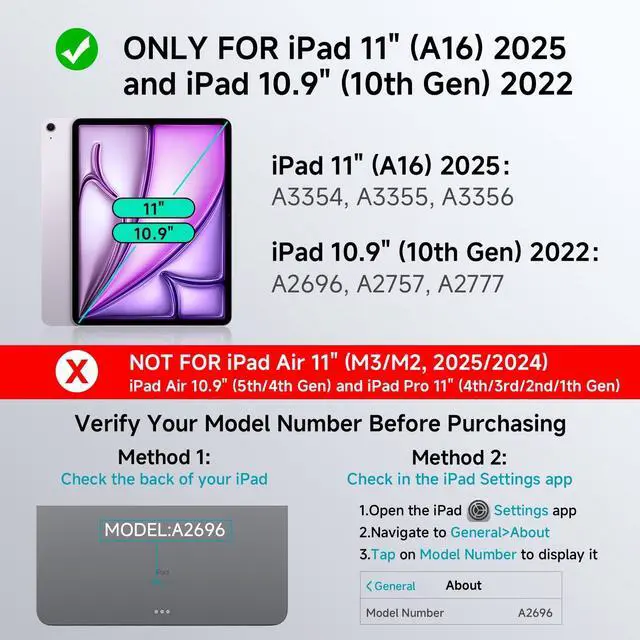 Your iPad: Designed exclusively for iPad A16 11th Generation 2025 (Models A3354/A3355/A3356) & 10th Generation 2022 (Models A2757/A2777/A2696). Please double-check your iPad's model number on the back cover to ensure a perfect fit ^^ 360 Rotatable Stand with 7