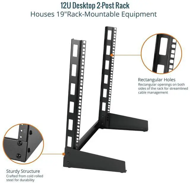 The versatile 19 inch desktop rack is a cost-effective solution for mounting your IT and network equipment. Constructed from high-quality cold-rolled steel, this lightweight rack supports up to 143lbs (65kg) of equipment, providing a solid and safe mounting solution for your mission-critical gear. Compliant with EIA/ECA-310-E standards, this rack is designed for efficiency and convenience. This versatile 2-Post Rack is perfect for organizing rackmountable equipment in various settings, from home offices to theater studios. Its compact desktop design allows for easy placement on any surface, be it a desk, table, or floor.