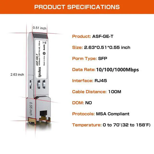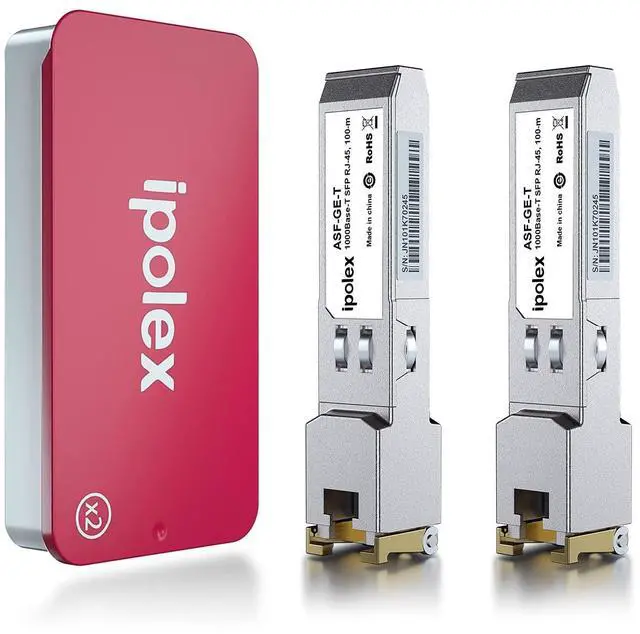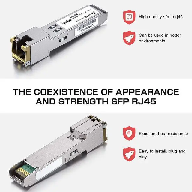 100/1000BASE-T Copper SFP to RJ45 Transceiver10/100/1000 Auto Negotiation, SFP to RJ45 connector, support links up to 100m over CAT. 5e, 2 Pack. ^^ Broad CompatibilityThis copper module is compatible with Cisco GLC-T(10/100/1000), SFP-GE-T(10/100/1000Mbps), Meraki. ^^ Easy InstallationPlug and Play, Hot Pluggable SFP MSA Compliant, IEEE Std 802.3 ab Compliant. ^^ High ReliabilityEach item is individually tested by a skilled technician to ensure premium quality, reliability and interoperability. ^^ Widely UsedIdeal for connecting a 10/100/1000M switch, router, server, NIC and other transmission equipment to RJ45 1.25 Gigabit Ethernet network for LAN applications and various networking places using copper connections.