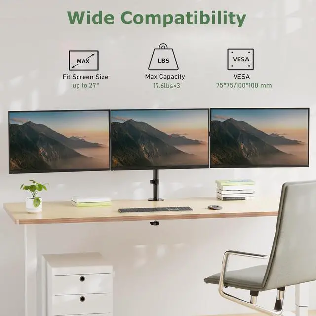 Universal CompatibilityUPGRAVITY 3 monitor desk mount fits most LCD, LED flat/curved computer screens up to 27 inch, and support weight up to 17.6 lbs per arm. Compatible with VESA mounting hole 75x75mm or 100x100mm. ^^ Height Adjustable to be AlignedThe triple monitor stand aligns your 3 screens at the same level for a comfortable viewing experience. Simply adjust the height of the VESA plates on both sides to be aligned with the central one. ^^ Flexible Angle AdjustmentThe triple monitor arm offers +45 to -45 tilt, 180 swivel, and 360 rotation for optimal viewing angles.