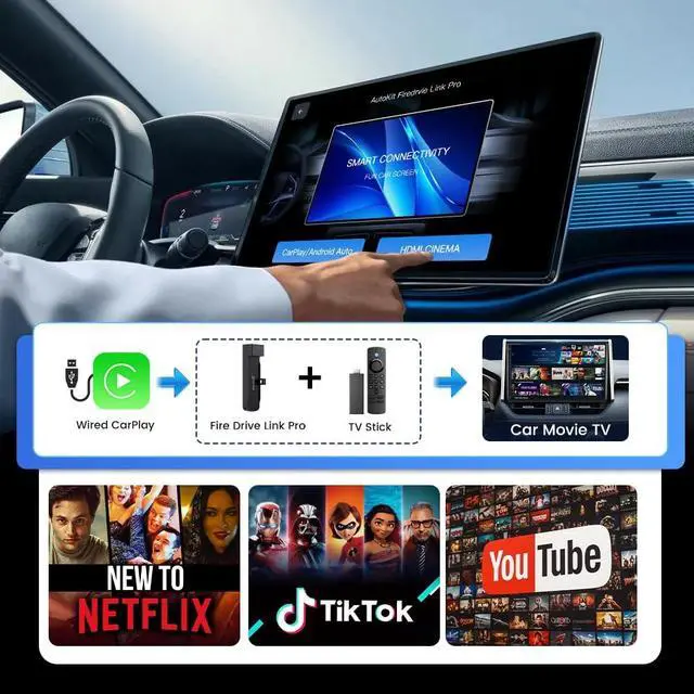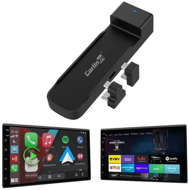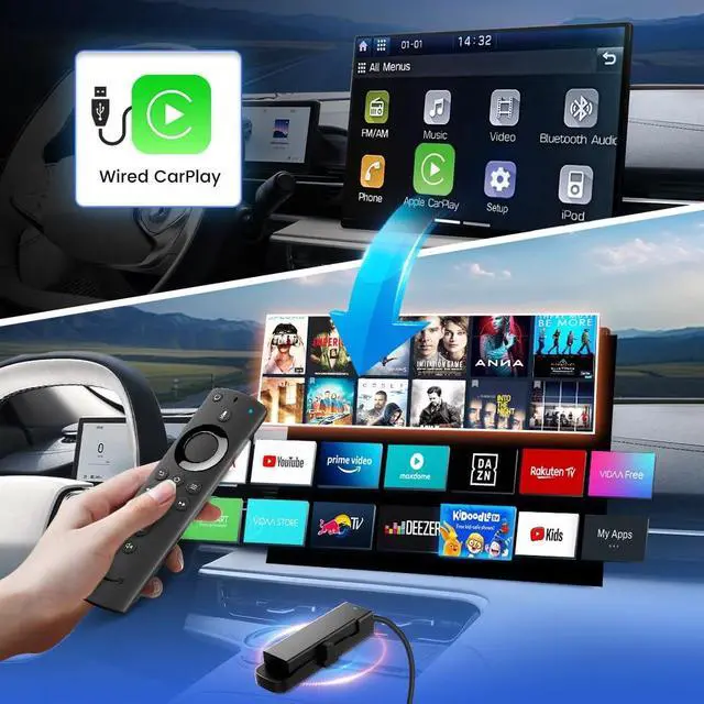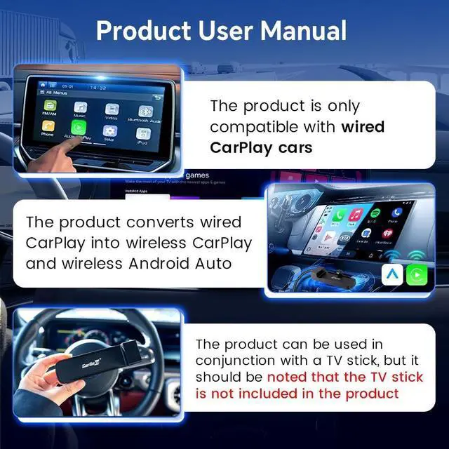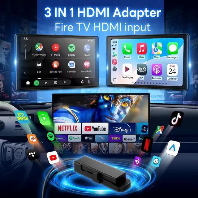 Wireless CarPlay Adapter 3-in-1Designed for TV sticksfor wired CarPlay carsSupports converting Wired CarPlay to Wireless CarPlay & Android AutoSupports and inputting Fire TV images into car multimedia screens through the product's HDMI port. ^^ 1. Dual-Mode Wireless Conversion for CarPlay & Android Auto This adapter seamlessly converts your factory-wired CarPlay into a wireless system. It also supports Wireless Android Auto, providing a clean, cable-free solution for a wide range of smartphones and vehicles. ^^ 2. Integrated Fire TV Stick Functionality for In-Car Entertainment Uniquely designed with an HDMI input port, it allows you to connect a TV Stick (e.