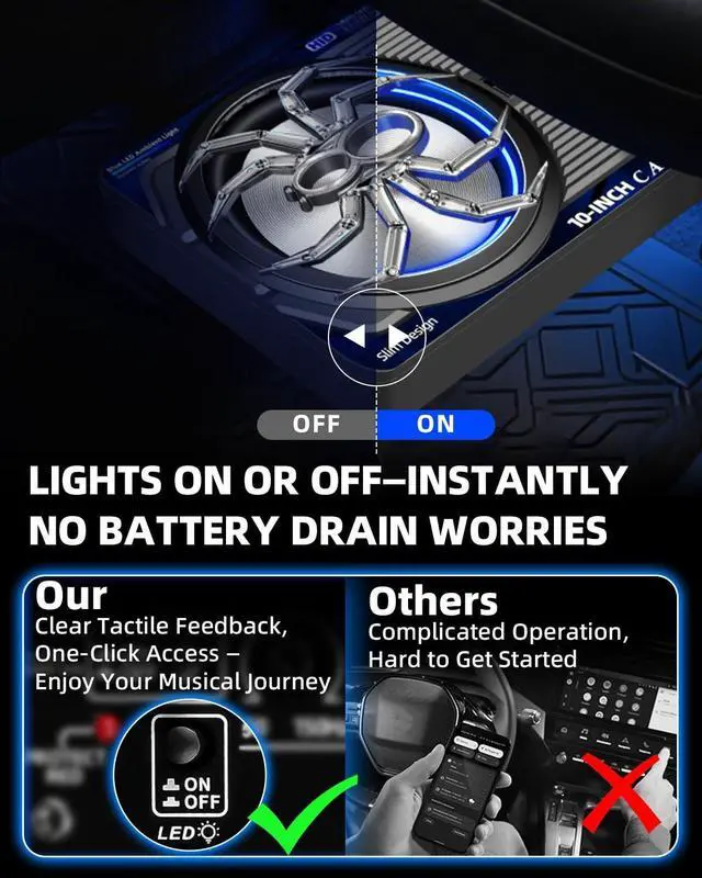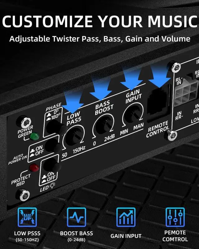 Rugged cast aluminum chassis ensures superior heat dissipation, vibration resistance, and durability. Ultra-slim design fits easily as an under seat subwoofer, behind seats, or in trunksideal truck subwoofer, car subwoofer amp combo, and underseat subwoofer with amp setups. ^^ FULL BASS CONTROL + PHYSICAL BLUE LIGHT SWITCH