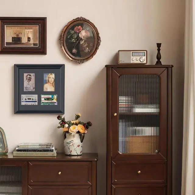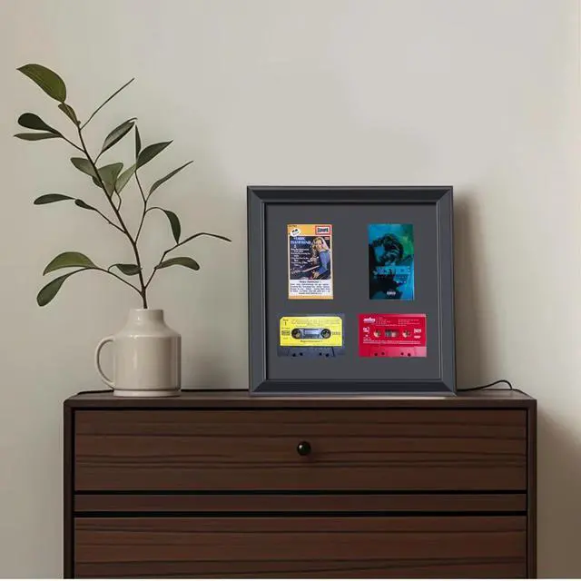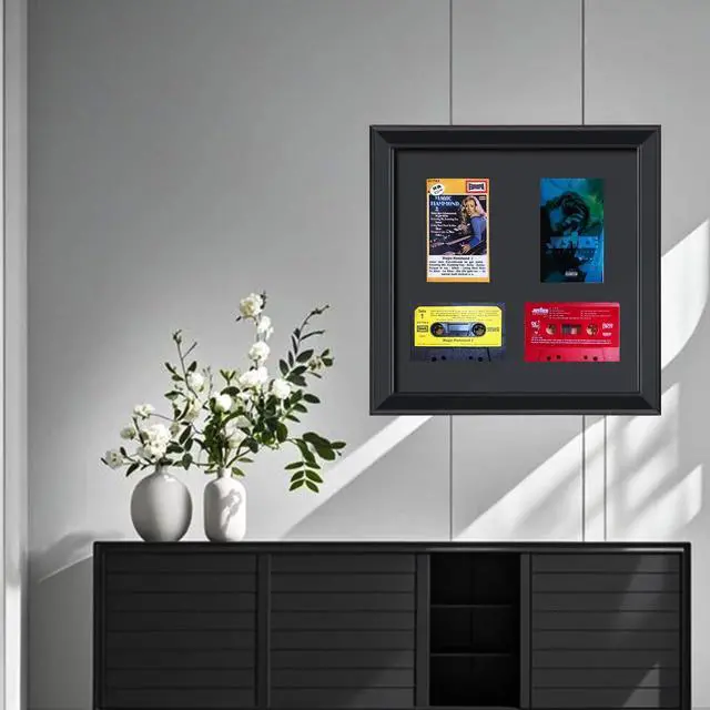 display box: does not contain any cassettes. )Cassette Tape Display Frame, Cassette Tape Storage-Cassette Ttape Holder high-definition tempered glass front panel blocks 98% of harmful UV rays, ensuring your tapes remain safe from fading, yellowing, dust, moisture, and bending. Whether youre preserving a rare mixtape or a beloved album, this display case offers long-lasting protection and crystal-clear visibility. Cassette Ttape And cCase Display-Measuring 11" X 11"X 1.77", the interior is perfectly sized to hold a standard cassette (4" X 2.5" X 0.6" ) and its case ( 4.25" X 2.75" X 0.6" ). The soft black flocked fabric lining and precision-cut EVA foam insert cradle your tapes securely, preventing scratches while adding a touch of elegance to your display. Tape Storage Box Display Frame, Cassette Rack, Installation is simple and flexible. Use the built-in hooks for wall mounting or place it on a shelf, desk, or table with the included stand. Whether in your home, office, studio, or music room, this frame adds a nostalgic centerpiece to any setting. Cassette Tape Storage Box Display Frame, audio cassette storage products, Looking for a unique and thoughtful gift? This cassette tape display makes a perfect present for music enthusiasts, retro collectors, or anyone who still treasures the magic of analog sound.