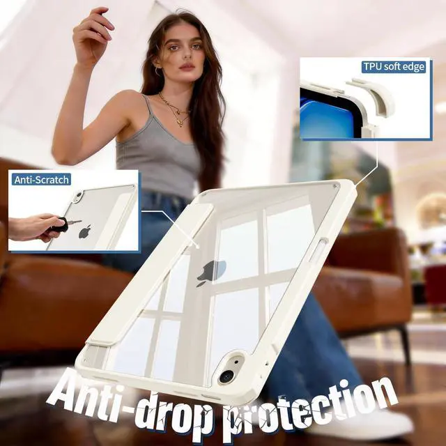 Stylish & Protective: Our iPad air 11 case with clear back cover, crafted from crystal-clear, scratch-resistant PC material, perfectly showcases the iPad's colors, complemented by a shock-absorbing TPU bezel matching the front cover's color. This combination provides 360 all-around drop protection while maintaining a stylish look and resisting yellowing(Please remove the transpar