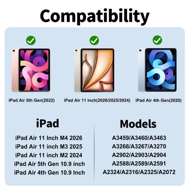 Precise Fit : Designed exclusively SQQSOOZ Case for iPad Air 11 Inch: M4 2026(A3459,A3460,A3463), M3 2025 (A3266/A3267/A3270), M2 2024 (A2902/A2903/A2904), 5th Gen 2022 (A2588/A2589/A2591), and 4th Gen 2020 (A2316/A2468/A2324/A2325). Go to Settings > General > About to verify your A model number for a guaranteed fit