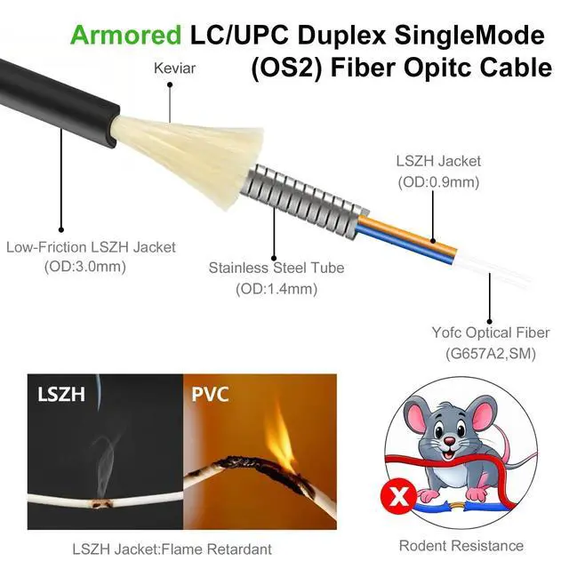 • Armored Protection & LSZH Jacket: Our network fiber optic cable features a stainless steel tube for robust armor, shield