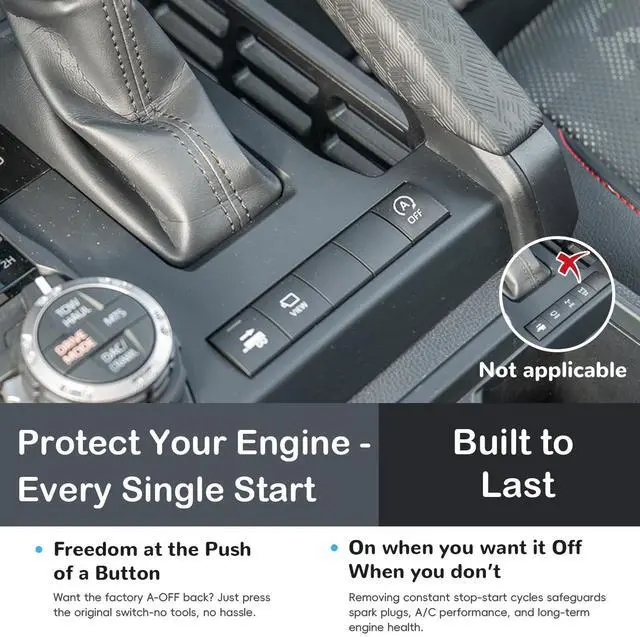 FitmentThe Auto start stop eliminator is perfectly compatible with Toyota Tacoma 2024 2025 2026. ^^ Auto Start Stop EliminatorAfter installing the Start Stop Eliminator, the default setting turns off the A-OFF function, eliminating the need for you to manually disable it each time. If you want the A-OFF function work again, simply press the A-OFF button to reactivate it. ^^ Enhance your driving experienceThe Start-Stop Eliminator can eliminate the jerks caused by the continuous starting and stopping of the engine when you get stuck in traffic, and reduce noise. ^^ Easy to installIt is equipped with disassembly tools.