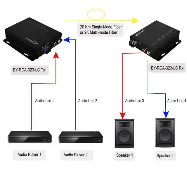 2 Channels RCA Audio over Fiber Extend to 20 Km SMF / 2 Km MMF, Supports 24 & 16-Bit Digitally Encoded Analog Audio ^^ Line Level Unbalanced Audio Operation to Optic Fiber ^^ No EMI, RFI, No Cross Talk / Audio Distortion and no ground loops; No Loss in Signal Quality; No Delay. ^^ Support Point-to-Point or Daisy-Chain (Cascaded Audio) connection ^^ LED Indicators for Instant System Monitoring ^^ Plug and Play (no software driver), Standalone or Rack Mount in FVC14 Chassis