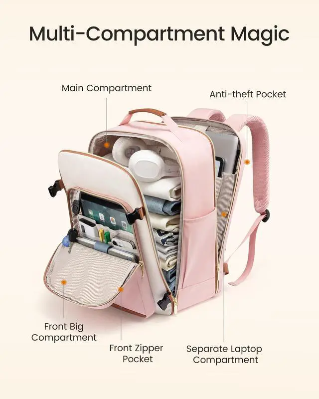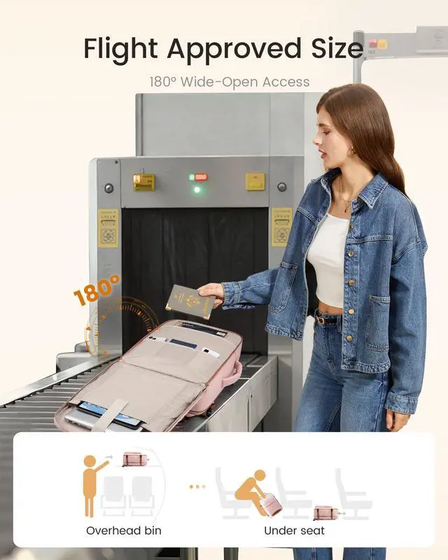 • Convenient 180-Degree OpeningWith a 180-degree expandable opening, this travel backpack simplifies security checks. Easily retrieve and stow items like a suitcase, making air travel hassle-free.