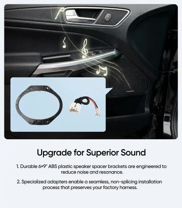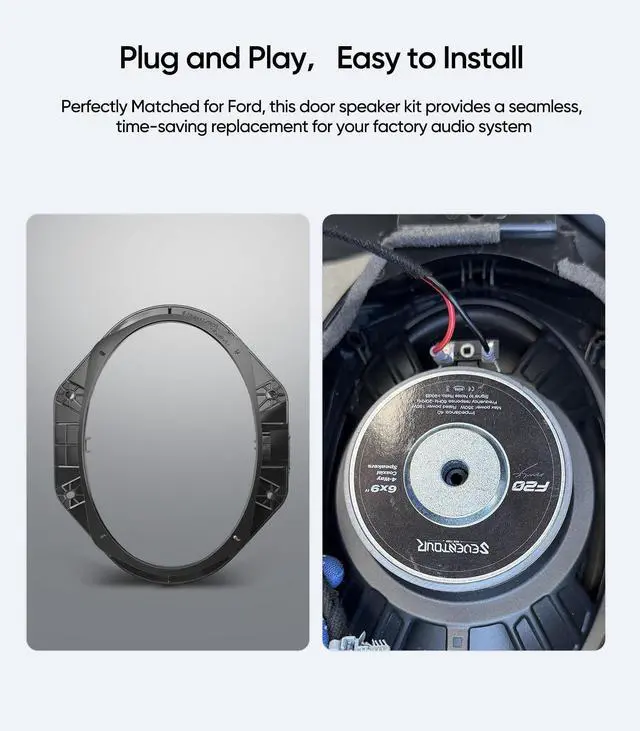 ^^ Upgrade SolutionThis Ford speaker adapter upgrade kit includes precisely engineered 69 inch speaker adapters and matching wiring harnesses, providing all necessary components for a professional audio system upgrade that maintains factory-fit integrity. ^^ ATTENTIONBefore purchasing, please verify your vehicle's year and model, confirm the shape of your original factory speaker, and check the shape of the speaker's electrical connector/plug to ensure proper compatibility and avoid errors and the inconvenience of a return. ^^ Customer Service SupportWe promise to replace the product with a new one if there is any product quality issue within 6 months, and repair the product without any charge within 1 year.