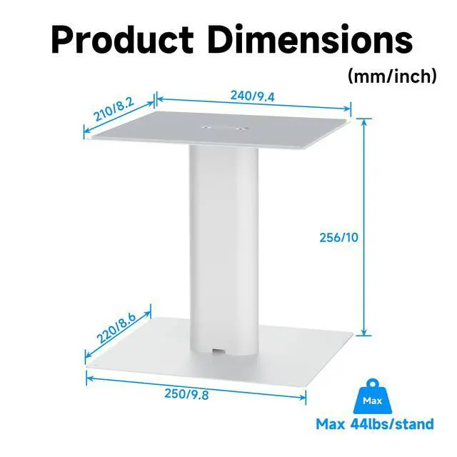 Set of 2 Sturdy Speaker Stands Includes two stands per pack, providing balanced elevation for stereo speaker setups, ensuring optimal sound staging and clarity. ^^ Perfect Height for Clear Audio 10-inch (256mm) elevation positions speakers at ear level for improved sound projection and a more immersive listening experience. ^^ 240x210mm ( 9.4 x 8.2" ) Top Plate Spacious and stable platform fits most desktop speakers, keeping them secure while minimizing vibrations. ^^ Non-Slip & Heavy-Duty Support Each stand holds up to 44lbs and includes an anti-slip mat to prevent movement and enhance audio performance.
