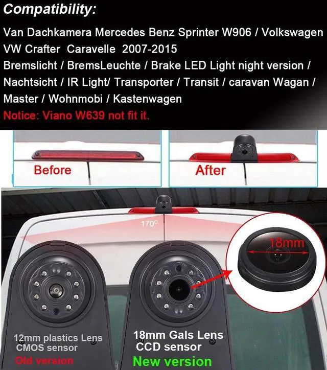 Dear customer, Please must check the camera size and appearance before place an order, see if can fit your car brake light place size and appearance! Because the same car model in different countries may have some difference, please check the camera size and compare the installation of your car carefully to avoid mistake. This product could fit for all below models as expected: Replacement for Mercedes Benz Sprinter 3-T 3.5 -T 4-T 4.6 -T 5-T Bus Kasten W906 B906 907 910 311CDI 313CDI 314CDI 31 5CDI 316CDI 316LGT 318CDI 319CDI 324 211CDI 214CDI 216 414CDI 416CDI 419CDI 509CDI 510CDI 511CDI 513CDI 514CDI 515CDI 516CDI 519CDI 524 2006/05-2024/12; Replacement for VW Crafter 30 35 Bus Kasten 2E 2F 2006/04-2016/05