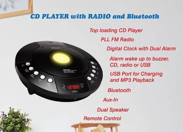 CD Player with PLL FM Radio, Digital Clock with Dual Alarm, Alarm Wake Up to Buzzer, Radio or CD, Red LED Display, Bluetooth, 1 USB Port for 1A Charging and MP3 Playback, Aux-in, Dimmer Function, Memory backup, Remote Control Included.