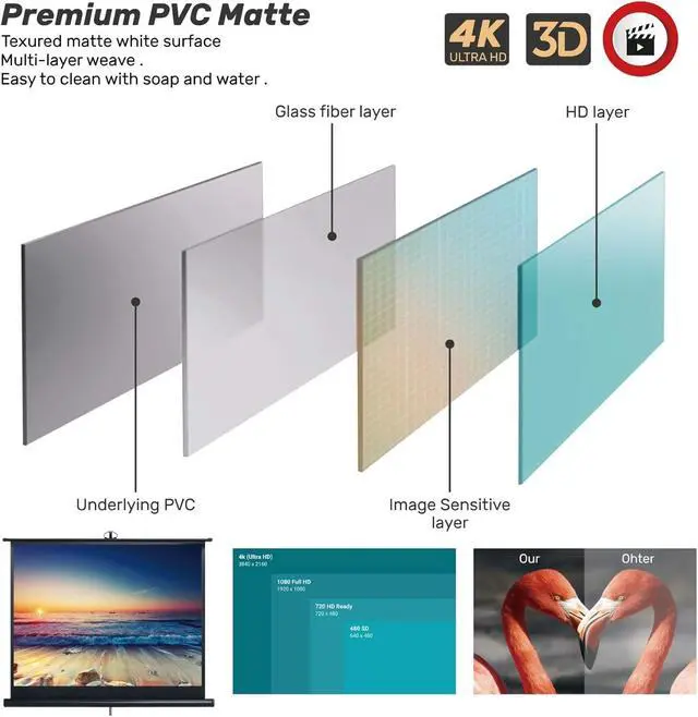 4-layer PVC: Black back layer blocks back light and enhanced contrast. Glass fiber layer ensures excellent wrinkle-free performance. Image sensitive layer enhance light reflection for brighter image. HD layer reduces diffuse reflection offers gain effect