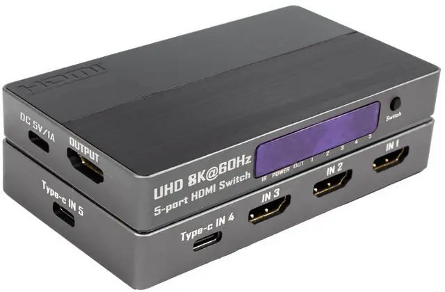 Power Port: DC 5V/1A, requires an external power adapter to ensure proper device operation. Switching and Indicator FunctionsSupports one-button switching of input sources via the control panel or remote control. During switching, the LED indicator light displays the currently active port. Some high-power devices may require a 3-6 second delay when switching signal sources. 4. Standard Accessories8K HDMI & Type-C Switching Unit, DC 5V Power Adapter, Remote Control, User Manual (1 each).
