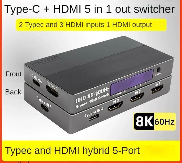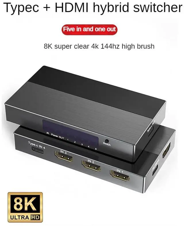 1. Product OverviewThe QT5 is a high-performance 8K HDMI & Type-C 5-port switcher featuring an ABS plastic housing with corrosion-resistant and overheat-proof durable design. Weighing just 103g and measuring 120.5 x 54.5 x 22.3 mm, it is easy to carry and install. The product supports 5 input ports (3 HDMI ports and 2 Type-C ports) for connecting devices and synchronously outputs signals to 1 HDMI display device. It supports one-click switching or remote control, eliminating the hassle of frequently plugging and unplugging cables. 2. Core Features and SpecificationsSupports resolutions such as 8K@60Hz, 4K@120Hz, and 1080P@240Hz, with a transmission rate of up to 48Gbps, and is compatible with all previous HDMI standards.