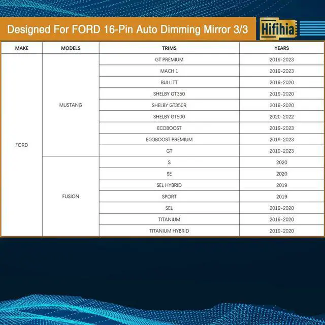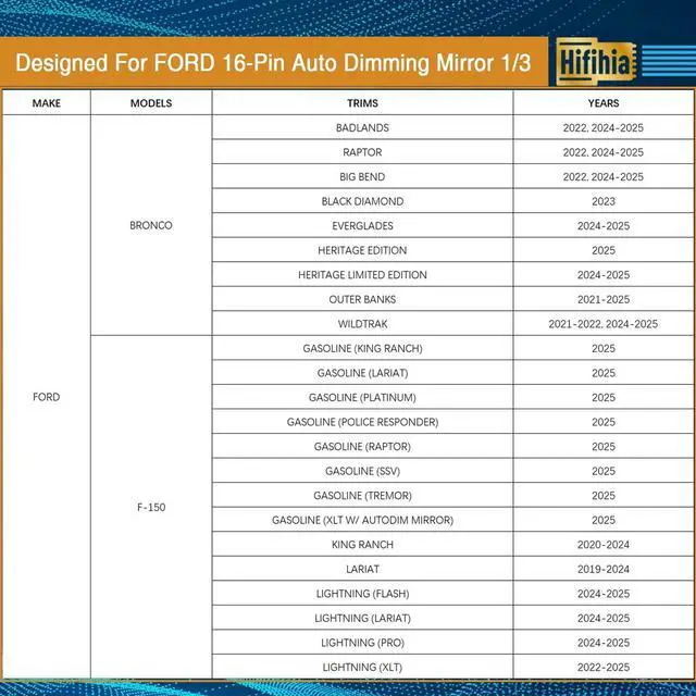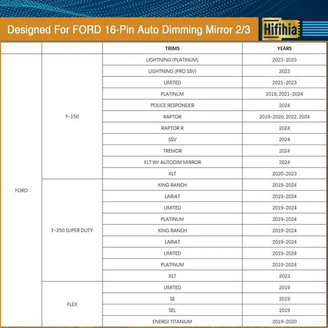 Vehicle Compatibility: Designed specifically compatible with Ford 16-pin mirror connectors. Confirmed compatible with select models including Bronco (non-sport, 2021+), Explorer (various trims, 2011-2019), F150 (various trims, 2011-2023), Ford Fusion (various trims, 2013-2017), Ford Mustang (various trims, 2013-2021), and more ^^