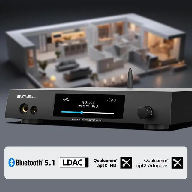 Coaxial and fiber optic support DOP64. ^^ Adopting DAC chip ES9039MSPRO, supporting MQA decoding and MQA-CD; Built in low-noise power processing, while improving power efficiency and reducing power consumption; ^^ You can use the remote control to play/pause/next/previous track. Using QCC5125 Bluetooth chip, supporting LDAC, apt XHD, and external Bluetooth antenna.