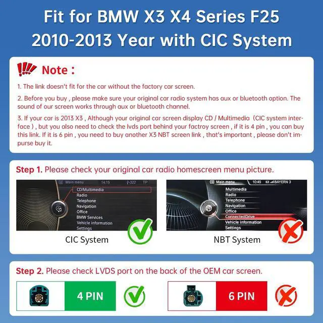 Don't impurse buy it: If your car is 2013 X3, Although your original car screen display CD/Multimedia (CIC system interface), but you also need to check the lvds port behind your factroy screen, if it is 4 pin, you can buy this link. If it is 6 pin, you need to buy another X3 NBT screen link, that's important. If you feel confused about this, please get help via us. ^^ Latest