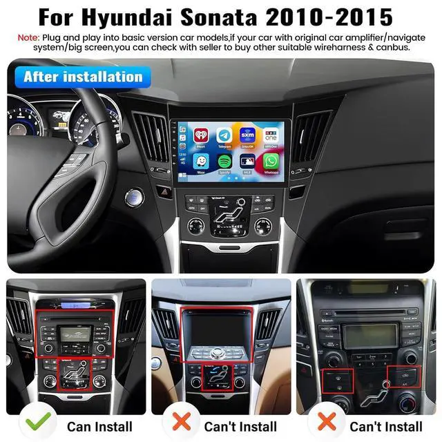 FM radio with 18 preset stations to get news, music or sports etc. Support dual mirror link function on the head unit to sync the phones app of map navigation, video etc.. For iOS phone, support one-way operation via WiFi, for Android phone with two-way operation via WiFi or USB ^^ Backup Camera Input & Driving RecorderThis wireless carplay stereo for Hyundai Sonata 2010-2015 with a AHD backup camera, the 9 inch touch screen will automatically switch to display the HD reversing image when you put car to rear gear. Wide viewing angle of rear camera, night vision and waterproof. The Android car stereo can input a driving recorder via USB slot, keep your car driving and get the important video ^^ Steering Wheel Control & Multiple Media PlayerThrough the steering wheel control buttons to operate car radio volume, change radio channels and switch songs etc. It is convenient and safer during the driving. This car multimedia player can also support video output, split screen, subwoofer connection etc. Any concern please contact us, we offer 30-day refund, 12-months replacement.