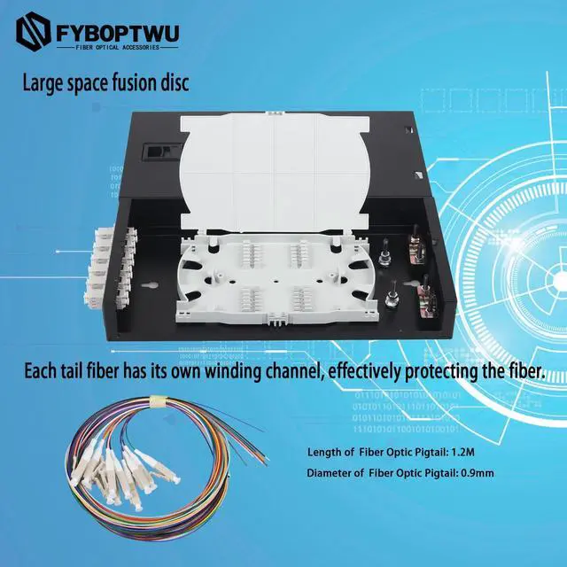 Large Space Fusion Disc Each tail fiber has its own winding channel, effectively protecting the fiber. ^^ Snap on DesignAchieving quick installation and maintenanceNo need to tighten screws. ^^ Thickness of Plate 1.0 mm; thickened and reinforced cold rolled sheet, sturdy and stableCorrosion resistant coating, long service life. ^^ Package IncludedBlack Mount, 12 pcs Pigtails, 6 pcs LC Duplex Multimode OM1 Couplers