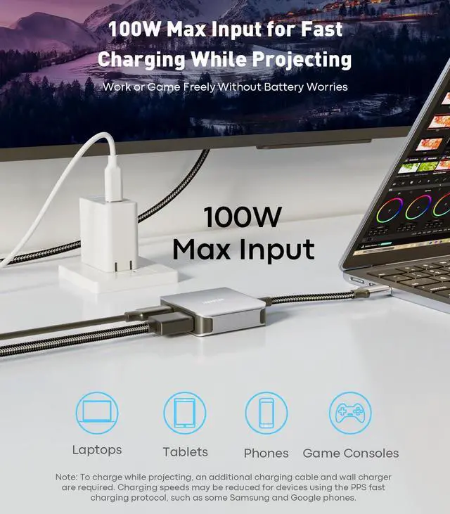 Note: Must be connected to a power source. 100W PD Fast Charging ^^ Power Your Play Equipped with PD 3.0 fast charging, delivering up to 100W power input. Charge your laptop, handheld console, or other power-hungry devices at high speed while you game or stream. Never let a low battery interrupt your entertainment. Broad Compatibility ^^ One Adapter for AllWidely compatible with all devices featuring USB-C (DP Alt Mode) ports. This includes, but is not limited to, the entire iPhone 15/16 series, iPad Pro/Air, Samsung Galaxy S24, and other latest smartphones, as well as mainstream laptops from brands like MacBook, Dell, and HP. It also supports popular gaming consoles such as Switch (1st and 2nd generations), Steam Deck, and ROG Ally. One solution for all your screen mirroring needs. Premium Build & Effortless Plug-and-PlayUSB Type-C to HDMI with PD Charging Adapter features an integrated aluminum alloy housing for efficient heat dissipation and rugged durability. The cable employs high-strength nylon braiding, offering superior resistance to pulling and bending with a lifespan far exceeding standard rubber cables. No drivers are requiredsimply plug it into your device for automatic detection and connection, delivering consistently reliable performance.