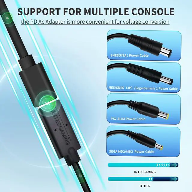 9V power cable designed for the following retro game consoles: SNES/PS2/FC/SFC/SEGA MD2/MD3, combining various styles of retro game console power cords together, multiple interfaces, free conversion ^^ PD fast charging mode, using induction chip IC, stable performance, solve the compatibility problem of models ^^ The newly upgraded 30w PD charging head is more compact and portable than the old large and heavy fire cow, making voltage conversion more convenient ^^ Equipped with an EVA data package, it can store power cords in large capacity, keep the power cords tidy, not messy and entangled, and convenient storage ^^ Affordable price, you only need to spend a small amount of money to have four power cords for different consoles at a time, and you dont have to worry about buying power cords