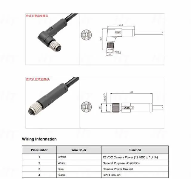 • M5 4pin female connector (camera side) to open end/ flying leads, over-molded IP67 waterproof