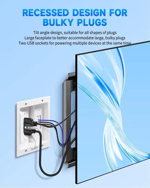 Say Goodbye to Cable Clutter The HAPYTHDA in-wall cable management kit hides HDMI, Ethernet, and A/V cables behind walls via a brush plate, managing TV power cords and low-voltage wires seamlessly. With 2 AC outlets (15A/125V), 2 USB-A ports, and low-voltage passthrough, it powers up to 4 devices while keeping your home theater clutter-free. The expert TV cord hider for wall mounted TV for a clean, organized setup. ^^ Space-Saving Recessed Outlet This recessed outlet maximizes wall space, letting you run cables neatly from outlet to TV. Dual outlets fit 2 plugs Perfect for wall-mounted TVs, A/V equipment, streaming devices, and LED lights centralize power in one hidden hub.