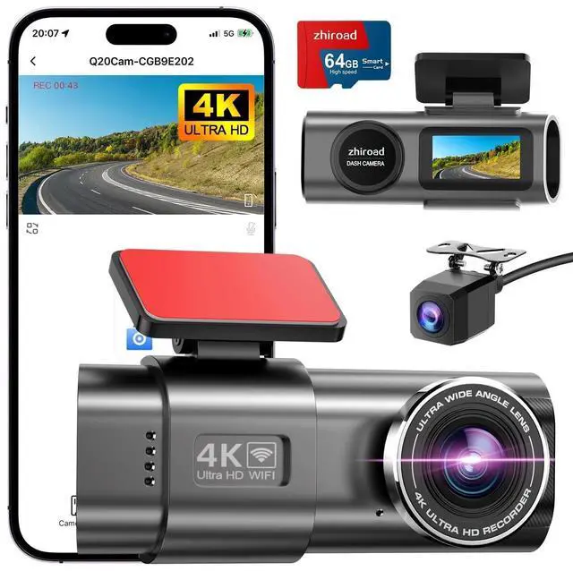CRYSTAL CLEAR 4K FRONT & REAR RESOLUTIONCapture every detail in stunning 4K Ultra HD (3840x2160P) with Zhiroads front and rear dual dash cams. Featuring a 170 wide-angle lens, this dual-camera setup ensures maximum coverage of your surroundings, from road conditions to license plates, providing clear and reliable footage for evidence. ^^ BUILT-IN WIFI & APP CONTROLEnjoy the convenience of controlling your dashcam directly from your smartphone via the app. Connect wirelessly without any subscription, and easily adjust settings, view live footage, or play videos. Share your journey on social media with just one tap - no need to remove the SD card! ^^ COMPACT & DURABLE DESIGNThe dash cam is made with a high-quality zinc alloy casing for superior heat dissipation, ensuring it withstands high temperatures and prevents deformation.