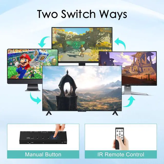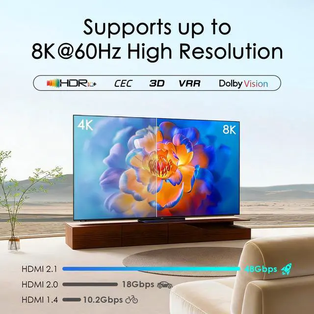 Fast Transmission: This HDMI switcher gives you HD transmission rates of up to 48Gbps at full bandwidth. Using 8K resolution or other high resolutions and high refresh rates requires an HDMI 2.1 cable to connect your device. ^^ The 8K HDMI 2.1 Switch supports