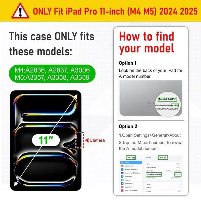 CompatibilityPlease Note: Designed Case for M5 iPad Pro 11 2025 (A3357/ A3358/ A3359), iPad Pro 11 (M4) 2024 (A2836/A2837/A3006), Not compatible with iPad Pro 11 Inch 4th Generation 2022 (A2435/A2759/A2761/A2762), iPad Pro 11 Inch 3rd Generation 2021 (A2301/A2377/A2459/A2460), iPad Pro 11 Inch 2nd Generation 2020 (A2228/A2068/A2230/A2231) and iPad Pro 11 Inch 1st Generation 2018 (A1980/A2013/A1934/A1979), Please verify the model of your iPad before purchasing ^^ Full