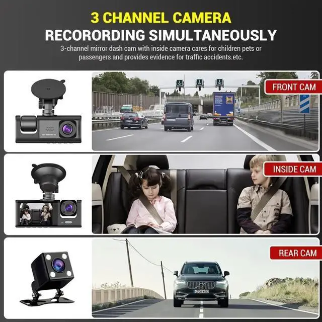 In-Dash CameraThree-Lens Dash Cam: This car dash cam features a front camera (170), a rear camera (120), and three cameras to monitor you from multiple directions. It can record driving video in super high-definition 1080p. Capture every detail of the traffic before and after you to avoid unnecessary traffic conflicts.