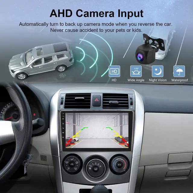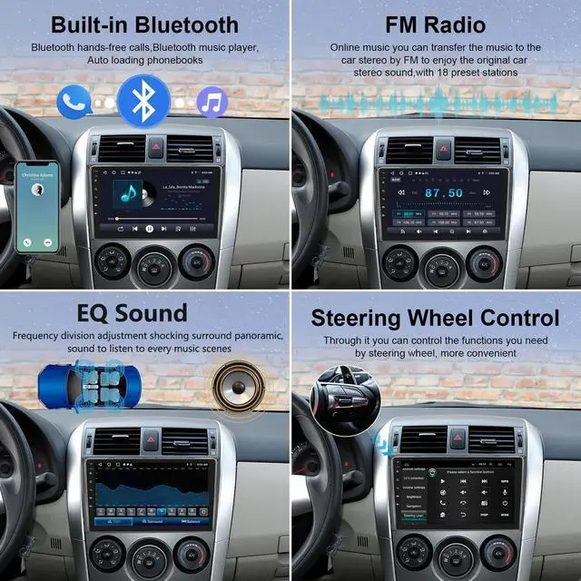 Screen size: 9'', Memory: 2GB (RAM) +64GB (ROM). ^^ Wireless Carplay & Wireless Android Auto & Mirror linkfor 2009 Toyota Corolla Car Stereo support use iPhone or Android phone wirelessly with the device, and control your phone's apps. can make calls, send messages, play music, navigate, and more with just your voice or touch. Support IOS/Android mirror link, use USB cable or WIF, mirror your phone's screen on the device's display, You can use your phone's apps, music, videos, and more on the device. ^^ WIFI & GPS Navigationfor 2010 Corolla car radio built in offline maps, after connecting to WIFI, you can download and update online maps anytime, anywhere, very convenient. With WIFI connection, you can also enjoy video and music, APPs sucn as YouTube, TikTok or Spotify can be installed or unloaded from app store. ^^ Rear View Camera Input & Steering Wheel Controlfor 2011 Toyota Corolla car stereo with backup camera supports automatic display of image. With easy installation and operation rear-view camera, when the vehicle shifts into reversethe car radio screen will automatically display the reverse image and record the traffic.