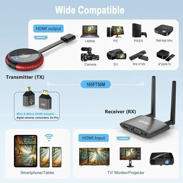 Robust 5.8GH z Immersive 4K MoviesThe TIMBOOTECH wireless HDMI transmitter and receiver features dual-band 2.4G and 5.8GH z wireless connectivity, with a dual LDS antenna design. It ensures smooth, uninterrupted video and audio transmission with an incredibly 0.1 s low latency. It enables you to cast a truly stunning 4K home theater experience. ^^ Plug and Play, Wireless FlexibilityTIMBOOTECH wireless HDMI transmitter and receiver kit P2P setup in 5 seconds gets you watching wireless video fast. No Wi-fi, apps, Bluetooth, or other settings are required. ^^ 165FT Long Range Transmission, Multi-TX CapabilityOur TIMBOOTECH wireless HDMI transmitter and receiver 4K can transmit uncompressed HDMI video/audio up to 165FT/50M wireless transmission long range.