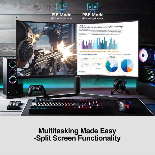 Display Functionality: The AG34P gaming monitor supports Picture-in-Picture (PIP) and Picture-by-Picture (PBP) modes, allowing you to view content from two different input sources simultaneously on one screen. This feature is perfect for multitasking, live monitoring, streaming setups, or comparing content without switching inputs.