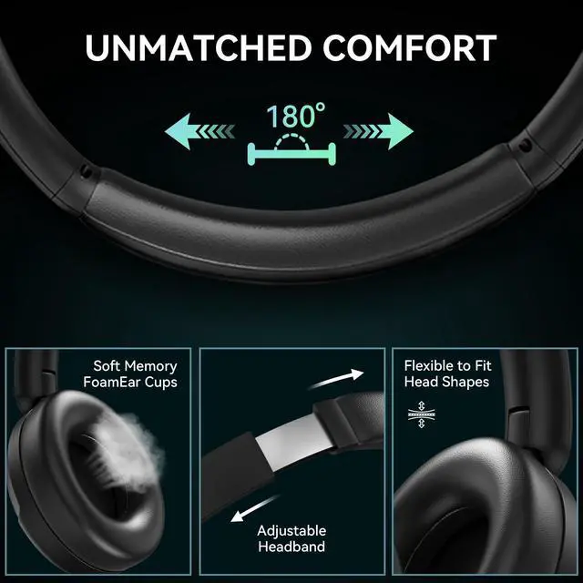 Pressure-Free Comfort: Over ear headphones features ultra-soft protein leather earcups with memory foam padding for a snug, comfortable fit over the ears. Adjustable headband accommodates different head sizes. Foldable design for easy storage and portability. Lightweight build ensures comfort during extended listening sessions ^^ 60-Hour