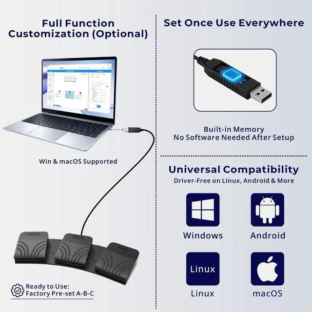 ^^ [TRUE PLUG-AND-PLAY: A-B-C PRE-SET] Works instantly without software! Comes with factory A-B-C default mapping for immediate use out of the box. Use our ElfKey software (Win/Mac) to save custom macros to the onboard memory chip. ^^ [5-IN-1 MULTI-MODE VERSATILITY] Fully configurable via 5 dedicated modes: Keyboard Mode (shortcuts/PTT), Mouse Mode (clicks/scrolls), String Mode (38-character text input), Multimedia Mode (volume/playback), and Macro Mode. ^^ [ERGONOMIC & ROBUST DESIGN] Front-hinged design minimizes ankle fatigue during long late-night sessions. Reinforced ABS shell and high-friction anti-slip base ensure rock-solid stability and reliability without unnecessary bulk. ^^ [VIDEO EDITING & CREATIVE FLOW] Accelerate your timeline navigation in Adobe Premiere and DaVinci Resolve. Map frame-by-frame scrubbing to your feet for a seamless, silent, and hands-free creative workflow. ^^ [CODING & DEVELOPER PRODUCTIVITY] Boost coding efficiency in VS Code or Terminal. Execute repetitive Git commands or code snippets with a single tap. The noiseless operation is ideal for shared workspaces and late-night coding. ^^ [REMOTE WORK & OFFICE MEETINGS] Master your virtual presence in Zoom, Microsoft Teams, and Google Meet. Toggle mic mutes or webcam controls instantly. Navigate large spreadsheets or Excel macros with precision. ^^ [ACCESSIBILITY & ASSISTIVE TECH] Provides vital assistive technology for hands-free PC control. Ideal for limited mobility needs and ergonomic assistance, ensuring universal access to digital tools and professional applications. ^^ [COMPLETE SUPPORT & WARRANTY] Includes Triple Foot Pedal ( 6.6 ft/2m cable) and Quick Start Guide.