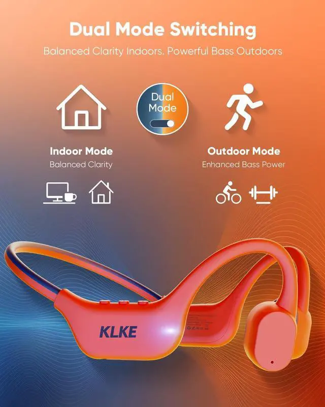 Enjoy a secure, stable hold whether youre jogging, sprinting, or training. ^^ Dual Mode Switching for Indoor & Outdoor Use Effortlessly switch between Indoor Mode for balanced clarity and Outdoor Mode for enhanced bass power. Whether youre at the office, at the gym, or cycling outdoors, KLKE adapts to your environment with a single button a key feature for users searching for open-ear running headphones or cycling-focused bone conduction devices. ^^ Rear Safety Warning Light for Night Activities Stay visible during night runs, cycling, hiking, or dog walking.
