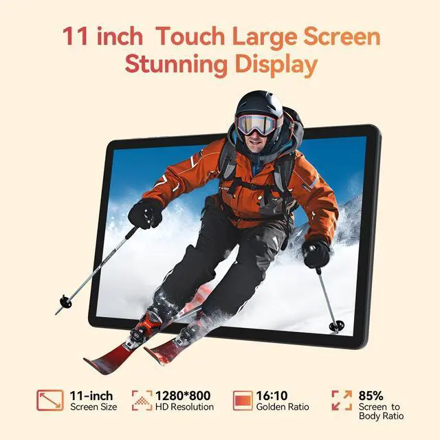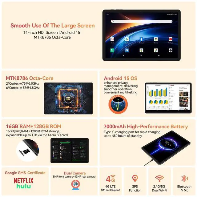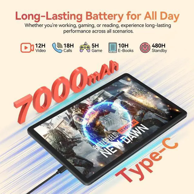 ^^ Long-Lasting 7000mAh Battery for All-Day UseThis 11-inch tablet powered by a high-capacity 7000mAh battery, this tablet provides up to 7-8 hours of continuous use on a single charge (actual usage may vary). Recharging is quick and convenient via the modern Type-C port. This reliable battery life makes it the perfect companion for extended activities like commuting, traveling, reading, watching movies, binge-watching your favorite shows, or listening to music. ^^ Dual Cameras & Immersive Dual SpeakersThis Android 15 tablet build-in a clear 8MP front cam and a 13MP rear camera, whether for video calls or photos, you can effortlessly take clear and detailed images.