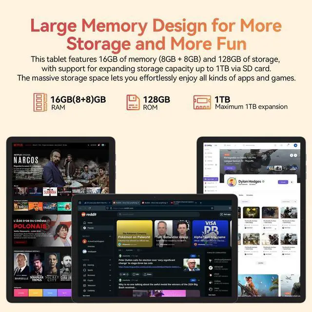 This advanced screen technology produces exceptionally refined, true-to-life colors and superior visual clarity. The sleek narrow-bezel design maximizes the screen area for a wider, more engaging viewing angle. The Android tablet also offers Reading Mode, Eye Protection Mode, and Dark Mode intelligently to minimize eye strain, ensuring comfortable viewing during extended use, whether you're working or enjoying entertainment. ^^ 16GB+128GB+1TB Expandable Large-Capacity TabletsThis 11-inch Android 15 tablet features 16GB of memory (8GB physical + 8GB virtual) and 128GB of internal storage, expandable up to 1TB via microSD card (card not included).
