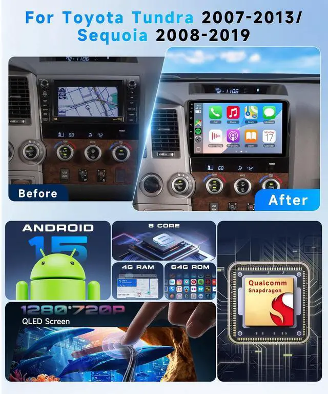 Plug-and-Play DesignTailored specifically for Toyota Sequoia 2008-2018/Tundra 2007-2013 models, this car stereo features a plug-and-play design that requires no extra modifications. This Toyota Tundra car radio fully supports steering wheel control, allowing you to adjust volume, change tracks, and answer calls without taking your hands off the wheelperfect for safe driving on US roads with your Toyota Tundra stereo. ^^ 1280P QLED Touchscreen & Android 15 OSBoast a 10.1 -inch high-definition IPS touchscreen with 1280*720 resolution for your car radio, offering an ultra-wide viewing angle, accurate colors, and crisp detailseven in bright sunlight.