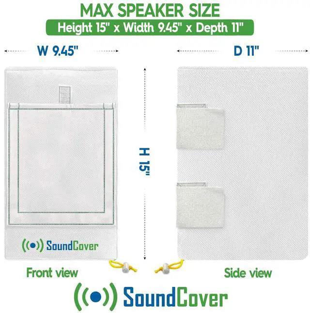 Max speaker dimensions: H 15", W 9.45", D 11". Check dimensions before purchase. ^^ Secure and Easy Installation Equipped with two heavy-duty touch fastener straps and a drawstring locking system for a snug fit. Straps can be trimmed for a custom, clean finish. ^^ Reinforced Double-Stitched Durability Built with reinforced seams to handle prolonged outdoor exposure. Comes with a SoundCover storage bag for convenient handling and storage.