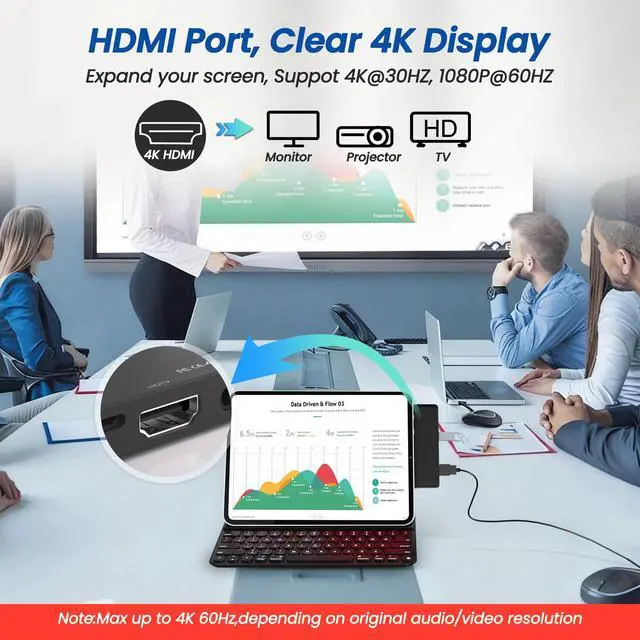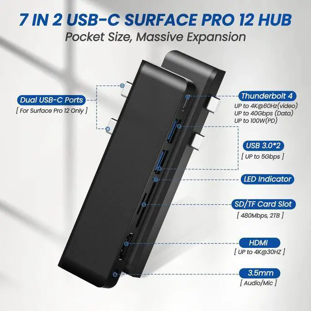 12. This all-in-one Surface Pro 12 dock expands your laptops 2 USB-C ports into a 7-port workstation. As the ultimate accessory for Surface Pro 12, it features a 4K HDMI port, USB-C Thunderbolt 4 (supporting 4K@60Hz video, 40Gbps data transfer, and 100W PD charging), dual USB 3.0 ports, SD/TF card readers, and a 3.5 mm audio jackall integrated into a sleek, compact design. ^^ Triple Display Docking Station for