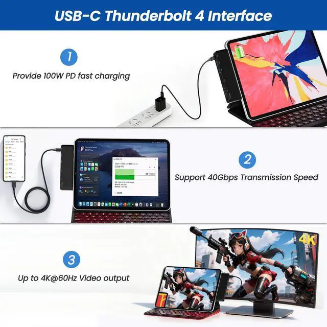 Surface Pro 12: Elevate your productivity with triple-screen support (UHD 4K HDMI + 8K Thunderbolt 4 + your Surface Pro 12 display). This Surface Pro 12 docking station dual monitor setup lets you extend or mirror screensideal for multitasking across projects. The Thunderbolt 4 port delivers up to 8K@30Hz, while HDMI supports 4K@30Hz. Perfect for video editors, photographers, and developers, this Microsoft Surface Pro 12 docking station transforms your workflow with stunning visual clarity. ^^ Blazing 40Gbps Data Transfer & 100W