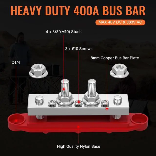 Superior Material: The 400A bus bar terminal block features 8mm( 0.32" ) thicker copper bus bar plate with stainless steel studs and nuts. Red Positive Busbar and Black Negative (Ground) bus bar as a pair ^^ 3/8"